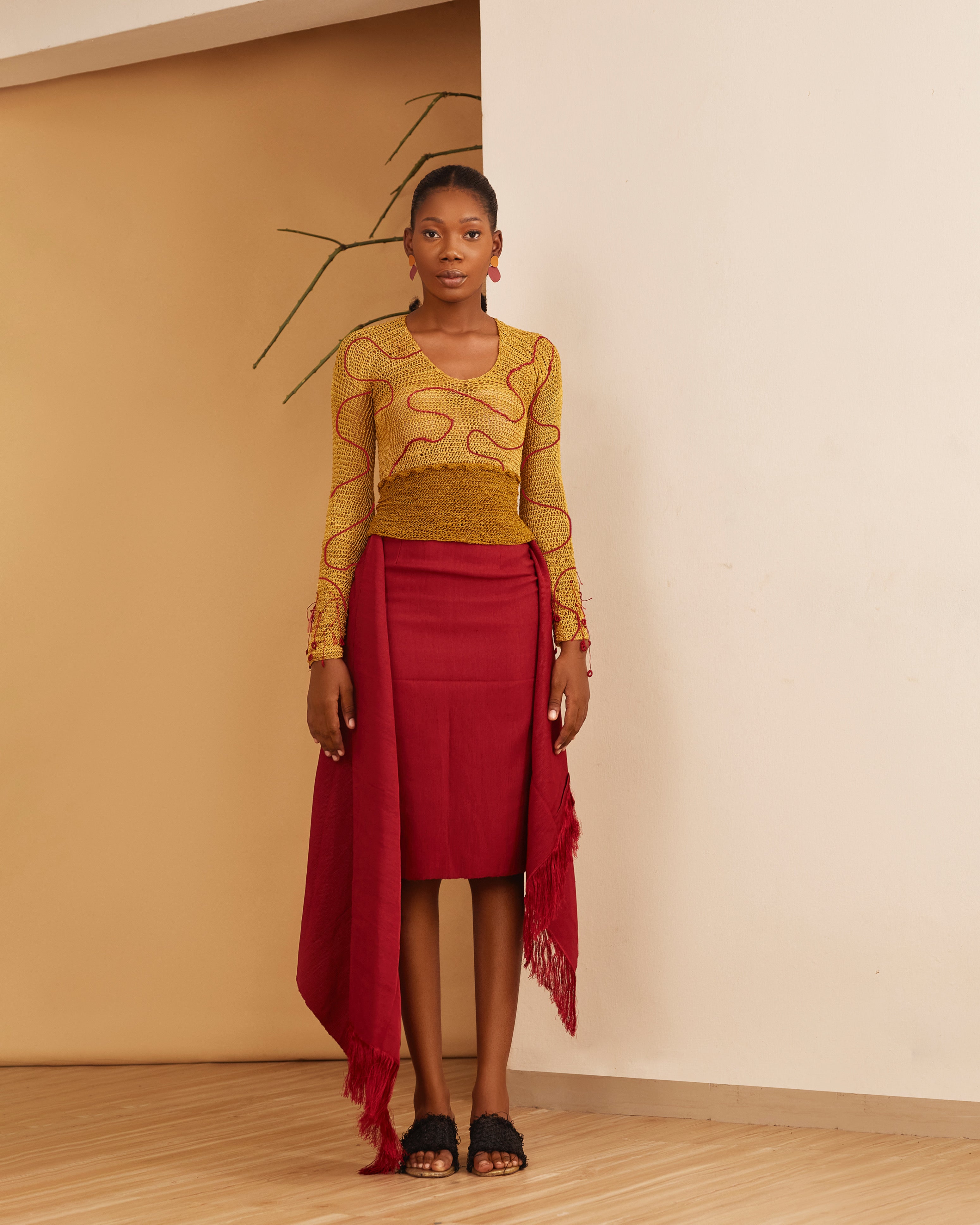The Zubi collection reimagines a modern woman through a contemporary approach, using delicate fringes and hand woven phoenix yarns to create scalloped patterns of various sizes. Linen, cotton fabrics, lurex organza and tulle are among fabrics that are used, which wraps around the natural female form. Pure and clean lines embody the apparent simplicity of our creations in neutral, earthy and bold tones. Our inspiration delves deeply into the Nigerian culture of celebrations. This is an ancient and sacred institution that is very integral in culture . Our presentation is a collection of timeless signature styles, delicately merged with an enhanced weaving technique; whilst embodying strong and structured silhouettes referencing a historic tradition.