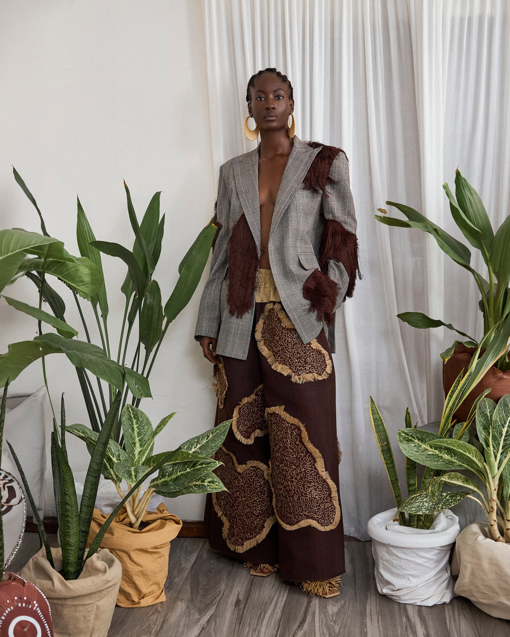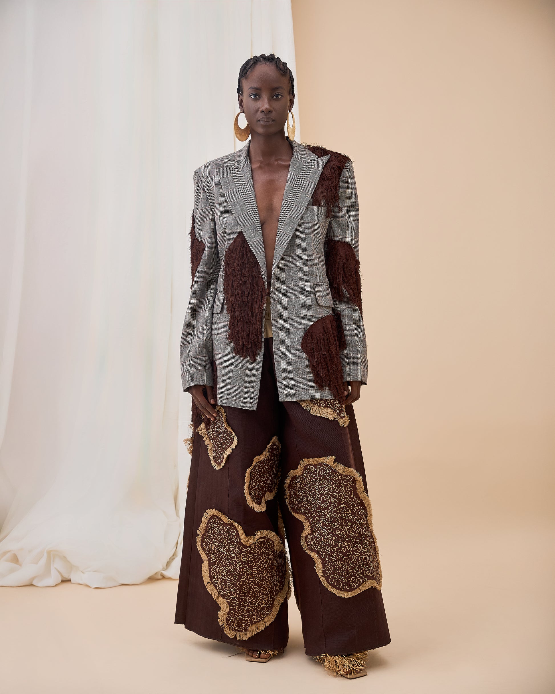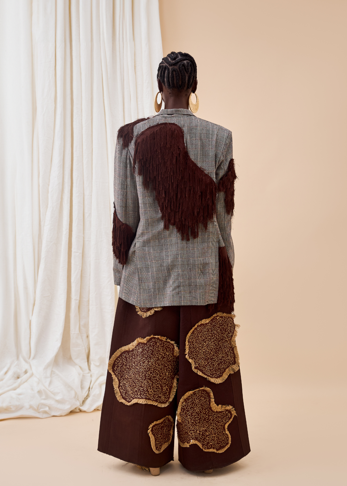 A structured blazer defined by subtle movement and texture. This piece is thoughtfully tailored and finished with hand-frayed fringes, adding a soft, tactile edge to its clean silhouette. The fringing is done by hand, each strand intentionally pulled to create a refined, lived-in feel without compromising its crisp structure.